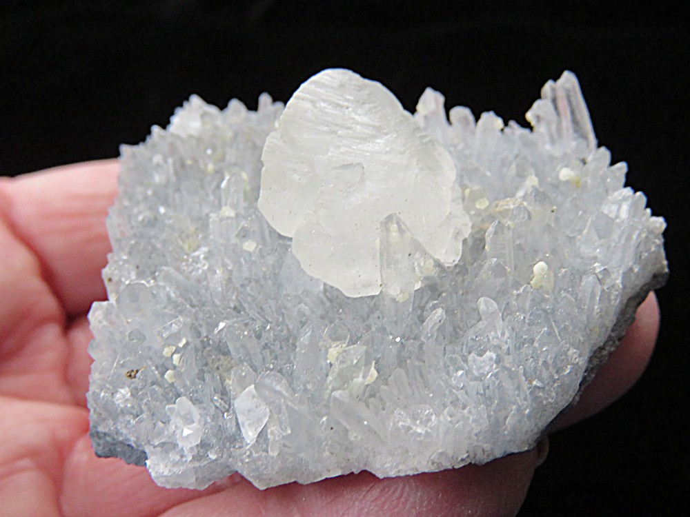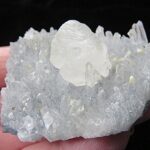 Calcite Crystal on Quartz Crystals. Krushev dol Mine, Madan Ore Field, Rhodope Mountains, Smolyan Oblast, Bulgaria. 5.5 cms x 4 cms x 2 cms